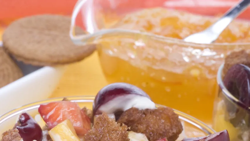 Receta de mugas dulces a base de bollo de leche y galletas integrales. Todo ello acompañado de frutas variadas: albaricoques, cerezas, fresas, melocotón...