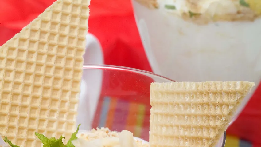 Machaca las galletas en un mortero. Espolvorea las galletas por encima de las dos copas, decora con los barquillos y unas hojas de menta. Reparte por encima los taquitos de mango y añade un toque de menta picada.