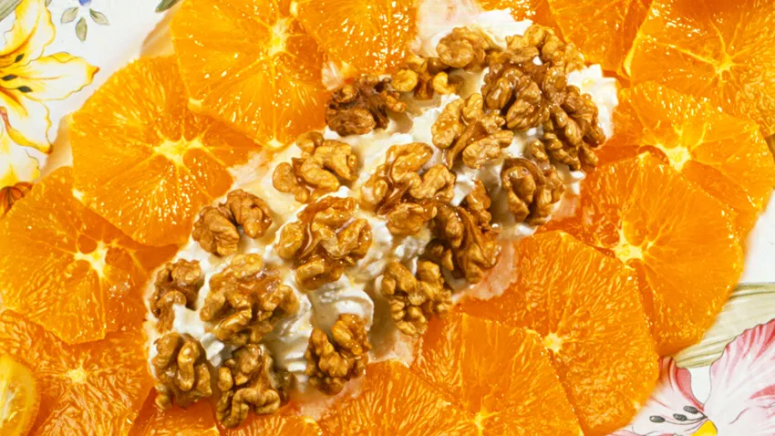 En el centro de la fuente pon la nata y esparce las nueces partidas y limpias.