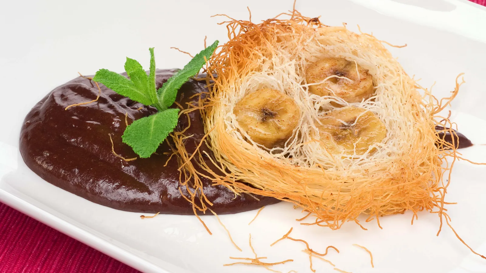 Postre a base de pasta kataifi para hacer los nidos con plátano horneado y acompañado de chocolate de cobertura fundido.