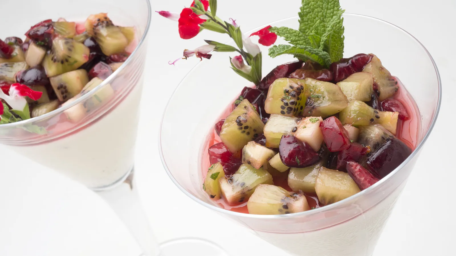 Retira las copas del frigorífico, pon la fruta encima de la panacota y decora con unas hojas de menta picada.