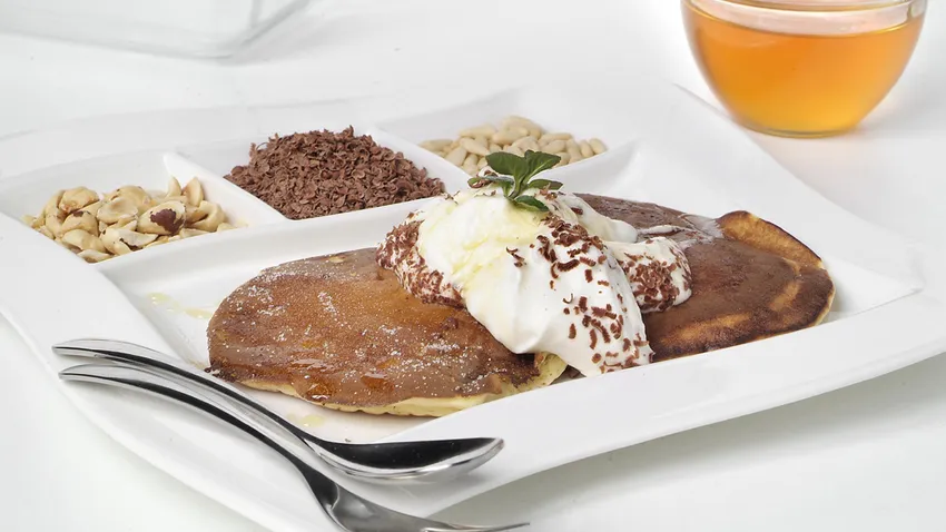 Receta de Eva Arguiñano de panqueques de maíz o tortitas acompañadas de chocolate, nata montada y frutos secos, perfecto para la merienda.