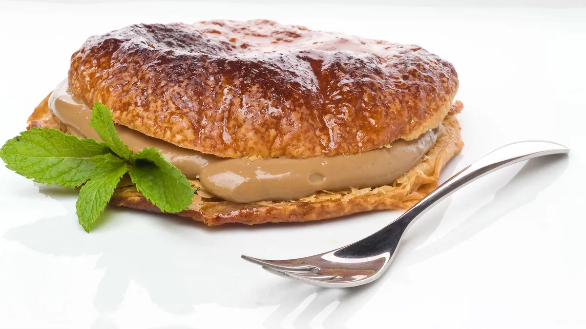 Receta de tortitas de hojaldre rellenas de una crema pastelera a base de huevo, leche y café soluble. Postre elaborado por Bruno Oteiza.