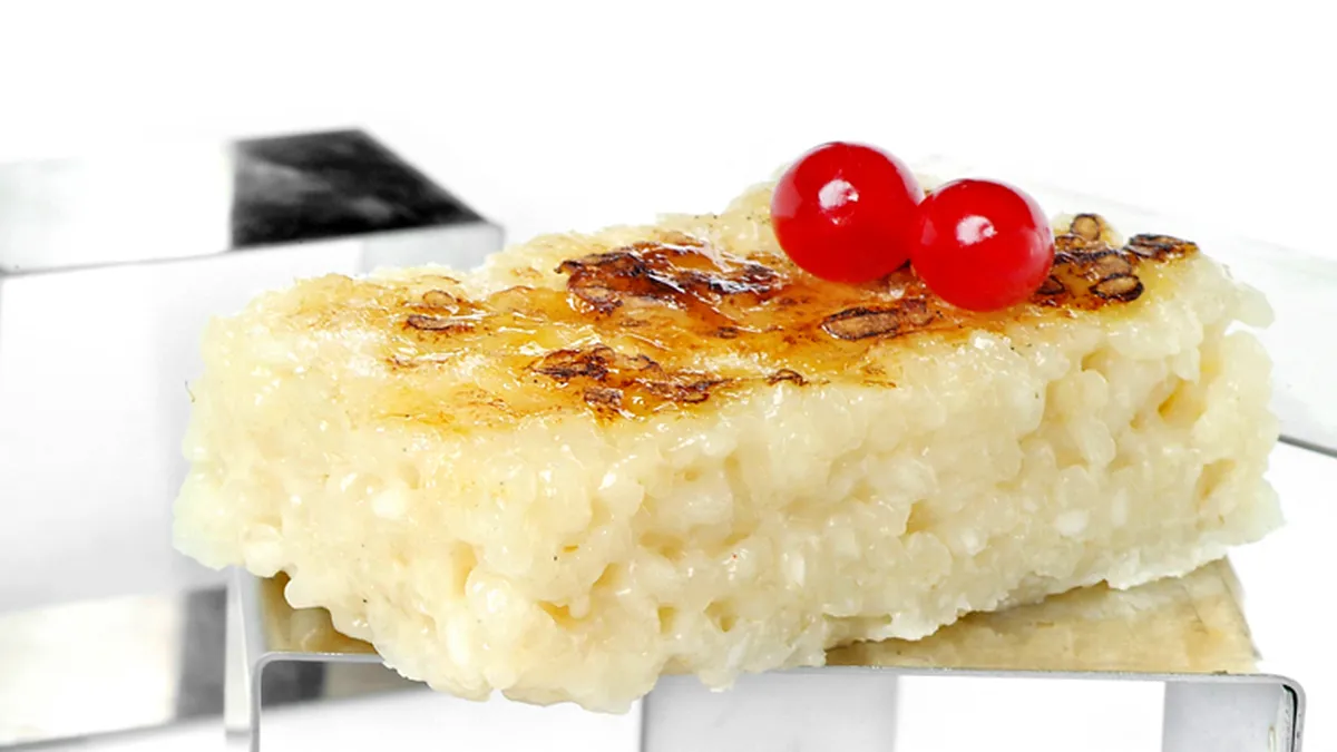 Receta de pastel de arroz con leche acompañado de un pesto dulce de albahaca y frutos rojos.