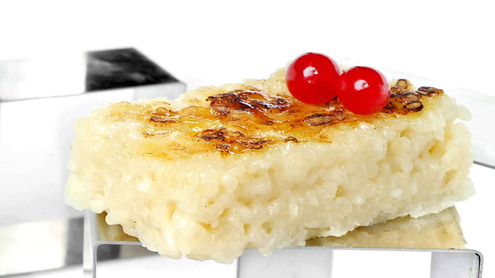 Una vez enfriado el pastel, córtalo con un molde pequeño en rectángulos. Pon un poco de azúcar por encima y carameliza con un quemador.