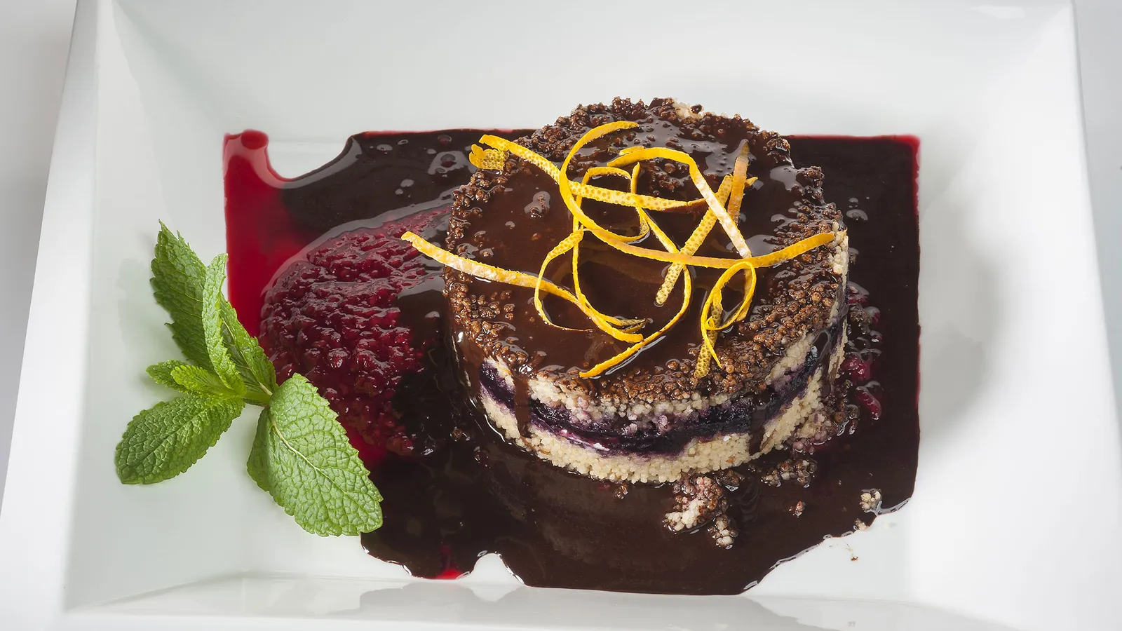 Postre sin azúcar de pastel de cuscús, orejones, pasas, almendras y coco con salsa de frambuesa y crema de algarroba, receta de la cocina macrobiótica elaborada por Zuhaitz Izarra.