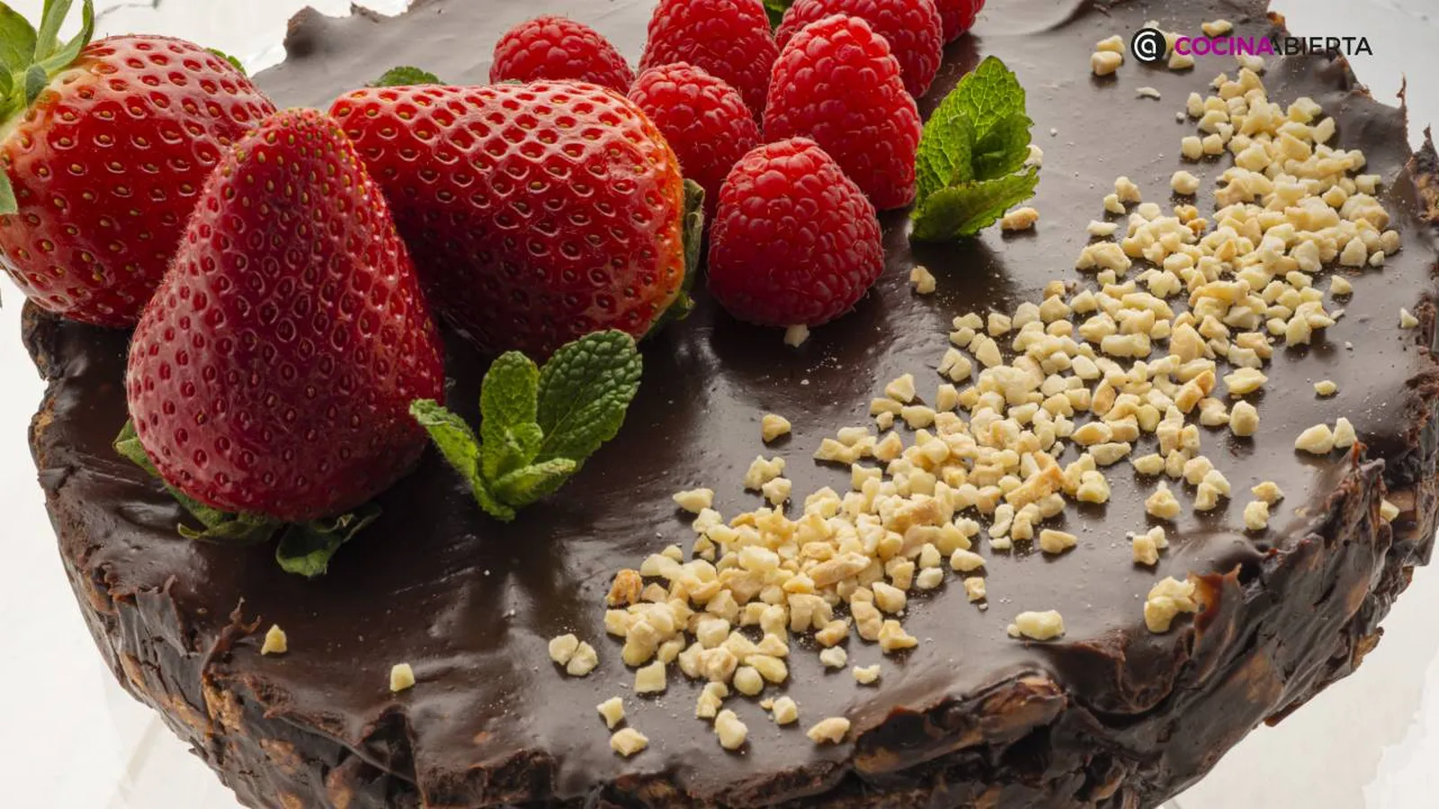 Desmolda la tarta de galletas y chocolate, espolvoréala con la almendra molida y adórnala con las fresas, las frambuesas y unas hojas de menta.