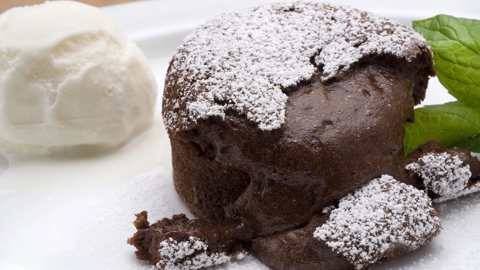 Saca del horno, deja que repose un minuto, colócalo sobre el plato a servir y retira el molde. Espolvorea con azúcar glas, acompaña de una bola de helado y decora con unas hojitas de menta.