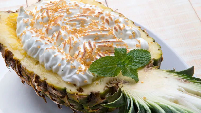 Receta de Eva Arguiñano de piña rellena de piña salteada con jarabe al ron y cubierta con merengue de lima caramelizado, un postre sencillo y rápido de preparar, ideal para Navidad.