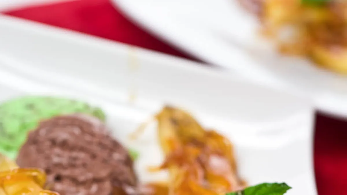 Sirve los plátanos con las cáscaras de los cítricos por encima y acompaña con unas bolas de helado (pueden ser una de menta y chocolate y otra solo de chocolate) en cada plato. Decora con menta y salsea con la salsa.