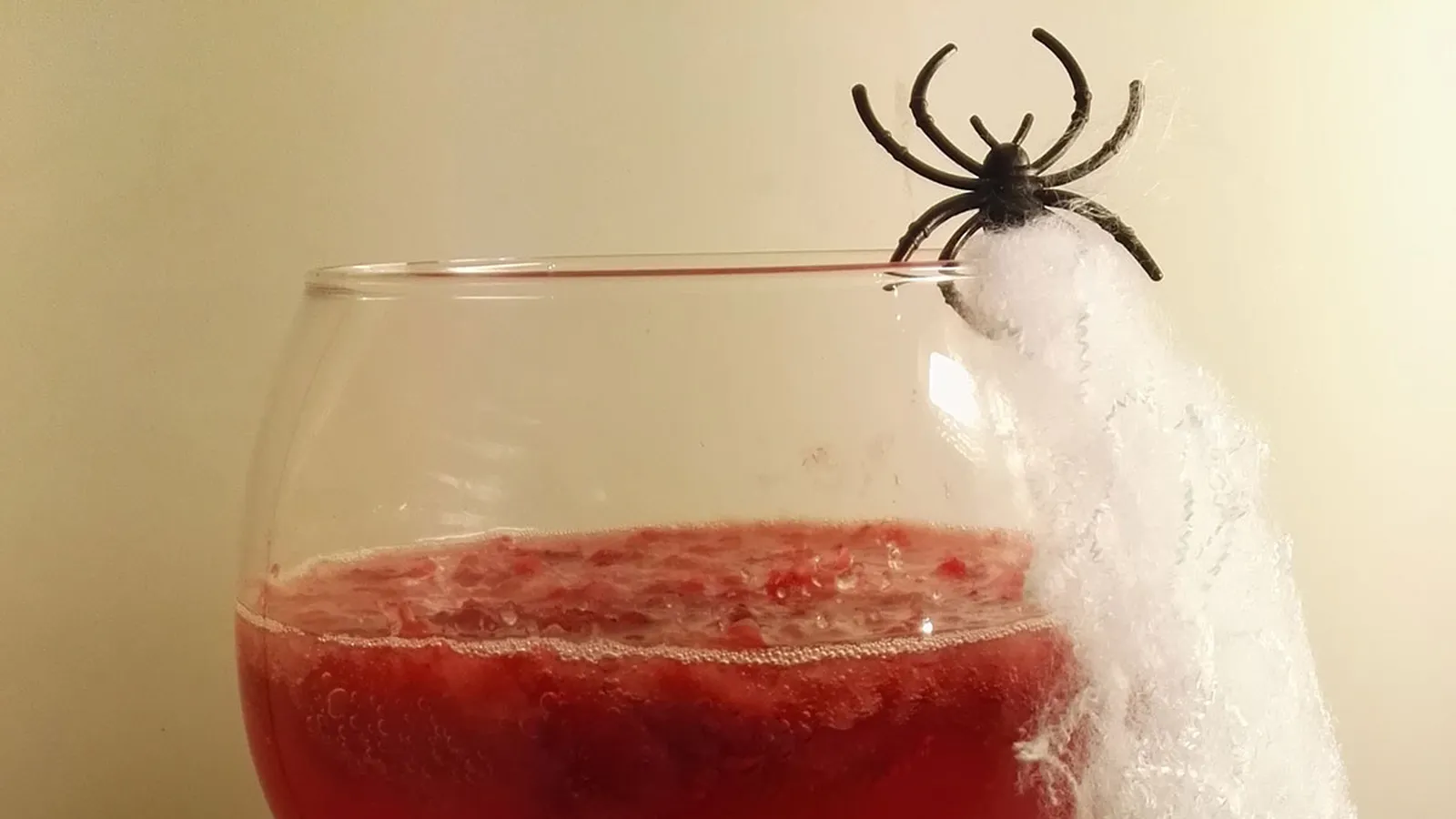 Repartimos la pócima en copas o vasos individuales y decoramos con varias arañas de caramelo o alguna golosina.