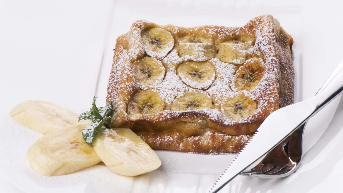 Postre a base de huevos, azúcar y requesón con plátano y mermelada de albaricoque.