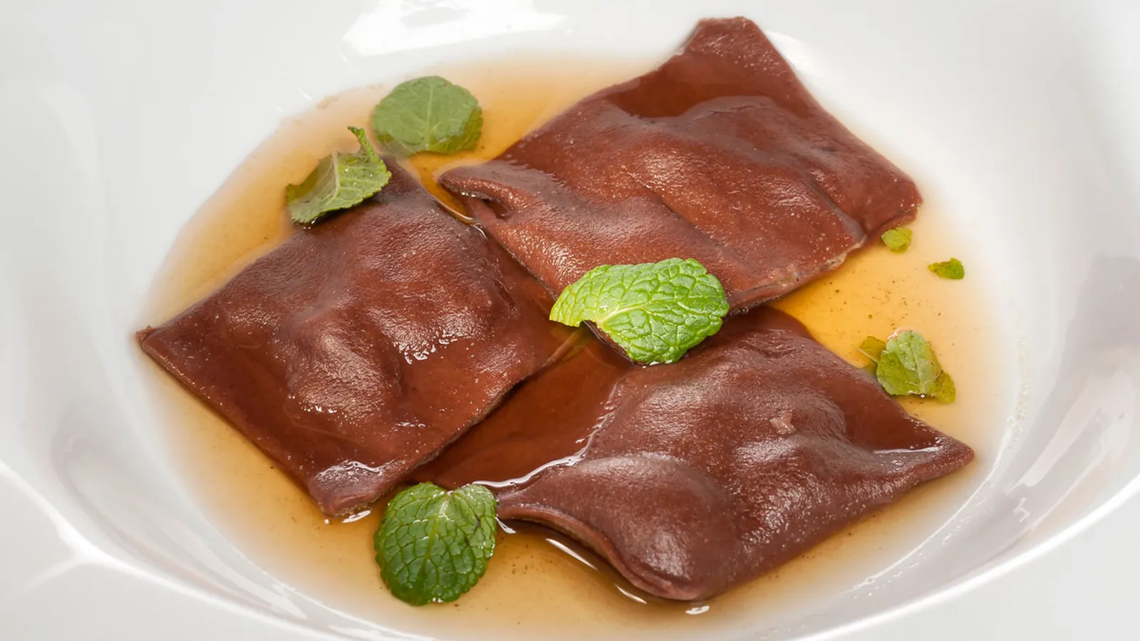 Postre de Bruno Oteiza de raviolis dulces elaborados con harina, cacao, mantequilla, huevos y azúcar, rellenos de mermelada de mandarina casera y acompañados de una infusión especiada de jengibre, miel, anís estrellado, pimienta y limón.
