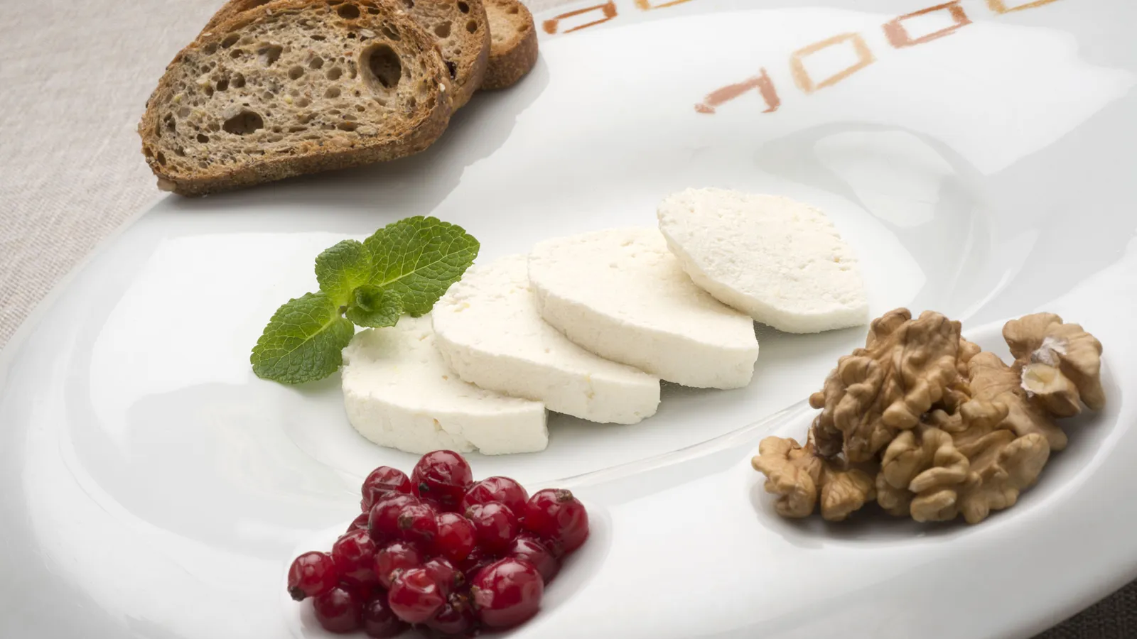 Sirve el requesón con el pan, las nueces peladas y las grosellas. Adorna con unas hojas de menta.