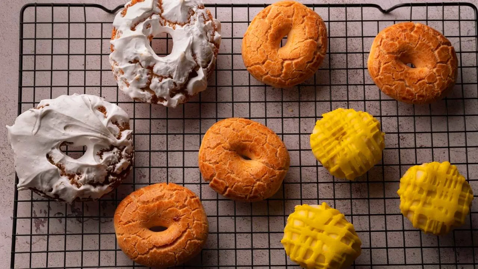 Remoja la parte superior de cada rosquilla en esta glaseado y colócalas sobre una rejilla. Deja que se sequen bien y luego hornéalas una hora a 100ºC con una bandeja vacía encima para evitar que les dé el calor directamente.