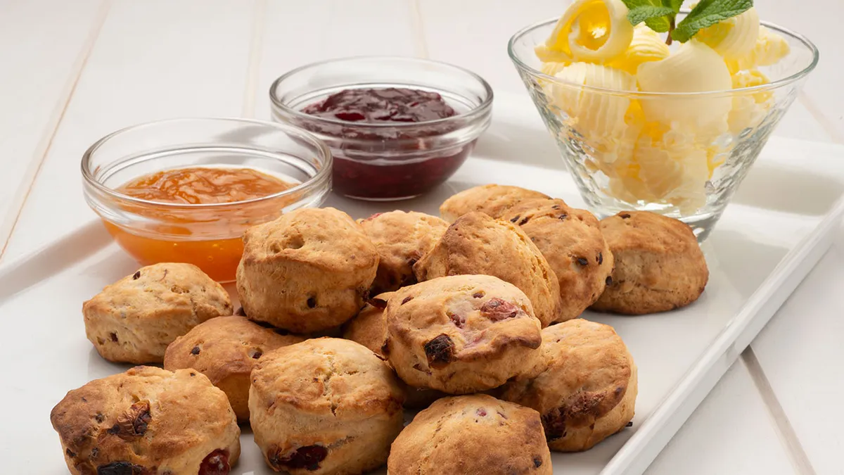 Acompaña los scones con mantequilla y mermelada. Decora con menta.