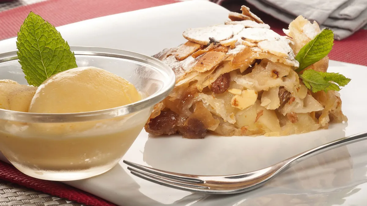 Bruno Oteiza elabora una deliciosa receta de strudel de manzana y almendras. El strudel es un postre de pasta tradicional de la cocina alemana y austriaca. El más popular es el Apfelstrudel, relleno de manzana, como en este caso.