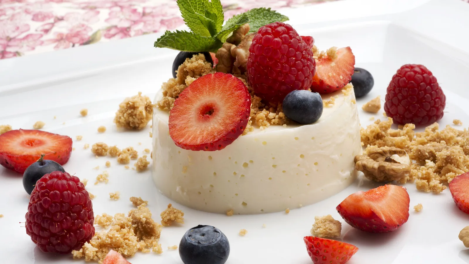 Eva Arguiñano prepara una panna cotta acompañada de migas de galleta, fresas, frambuesas, arándanos y nueces, un postre frío fácil de preparar.