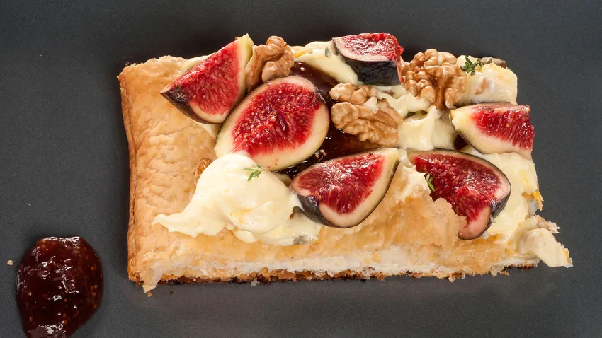 Pon un poco de mermelada sobre el hojaldre. Coloca también unos montoncitos de queso de maracuyá y por último, los higos frescos cortados en cuartos y algunas nueces. Decora con unas hojas de tomillo.