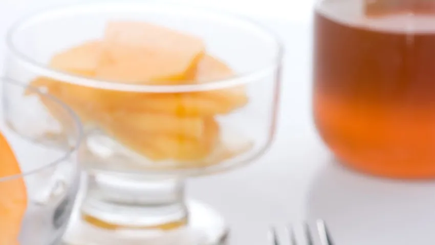 Pela los kakis, córtalos en medias lunas finas y colócalos en una fuente. Ablanda la miel en el microondas y viértela por encima del kaki. Deja reposar para que se empape bien el kaki con la miel.