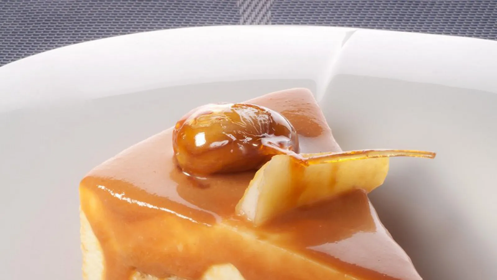 Cubre la tarta con el toffee y desmóldala. Retira el plástico. Decora con las peras y con las castañas caramelizadas.