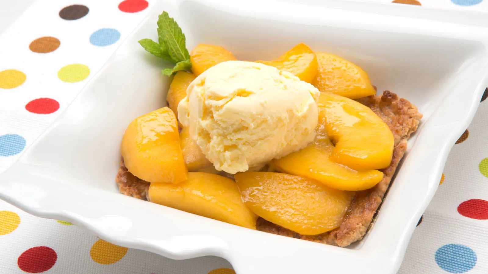 Receta de Eva Arguiñano de tarta de verano, un postre con base de galletas y queso horneadas cubiertas con melocotones salteados al vodka y helado de vainilla.