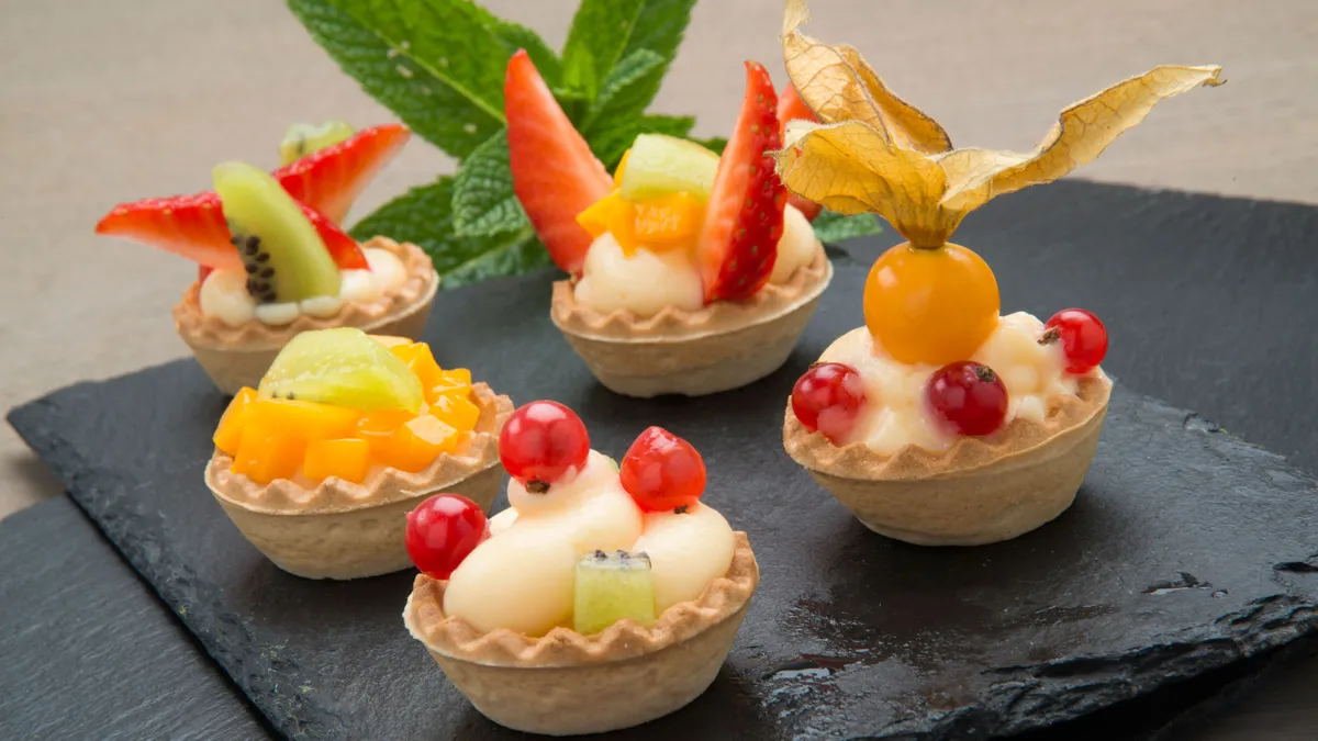 Limpia las frutas y córtalas en trocitos. Pon en la base de las tartaletas alguna fruta sorpresa (grosella, trocito de mango, trocito de kiwi...), sirve encima botones de crema pastelera y decóralas con otros trocitos de fruta.
