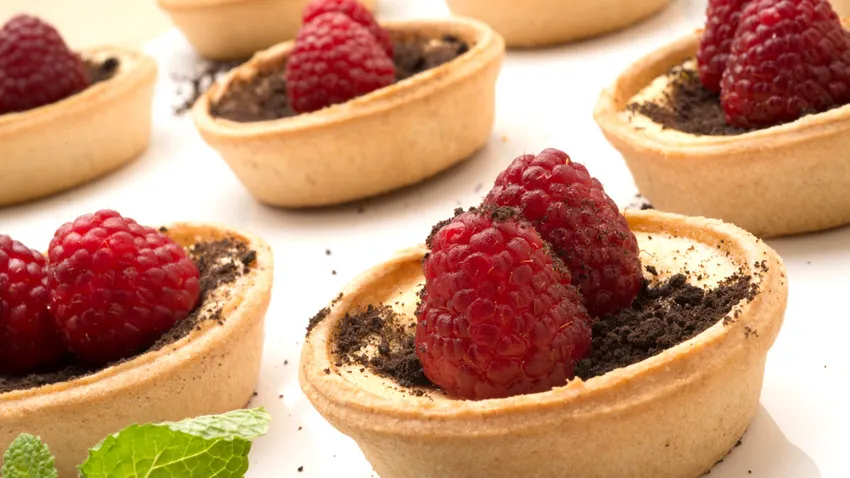 Receta de Eva Arguiñano de tartaletas rellenas de flan de yogur elaborado en el horno, acompañado de frambuesas maceradas y polvo de galleta de chocolate, un postre sencillo e irresistible.