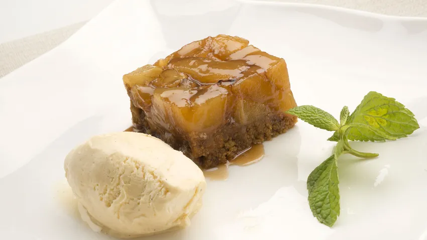 La tarta tatin tiene como peculiaridad que se elabora al revés. Es decir, debajo se coloca la fruta y encima la masa que será la base. A la hora de desmoldar, se le da la vuelta, de modo que la fruta queda encima.