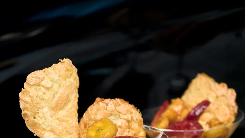 Postre a base de almendras y plátano. Receta de Tejas de almendra con plátano de Eva Arguiñano.