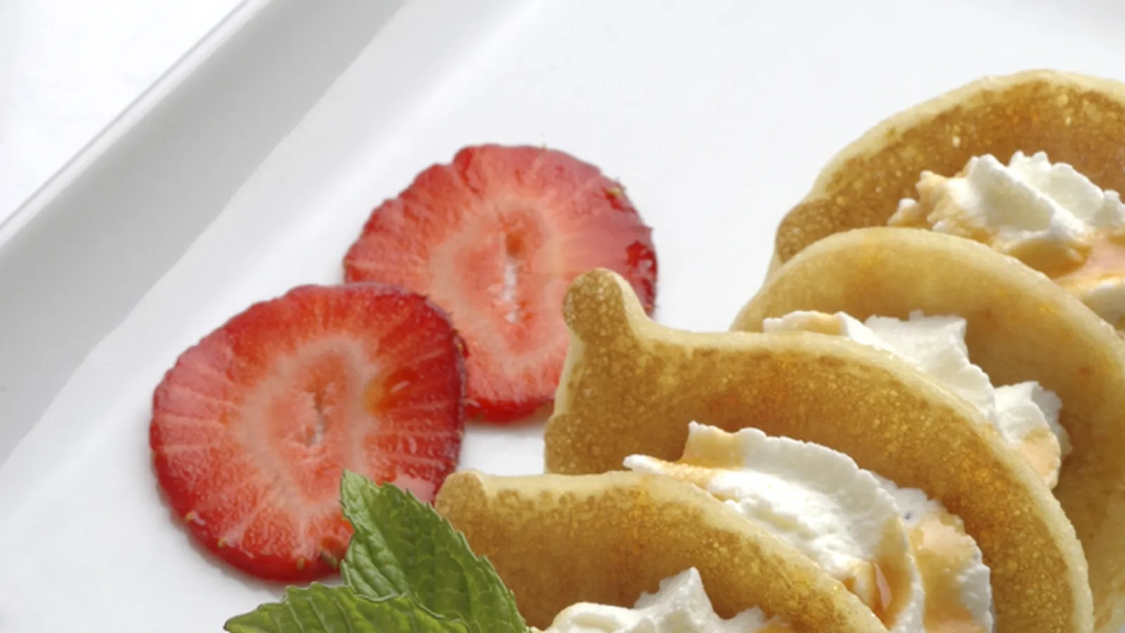 Sirve a tu gusto alternando las tortitas con la nata aromatizada. Salsea el plato con un poco de caramelo. Adorna con unas fresas y unas hojas de menta.
