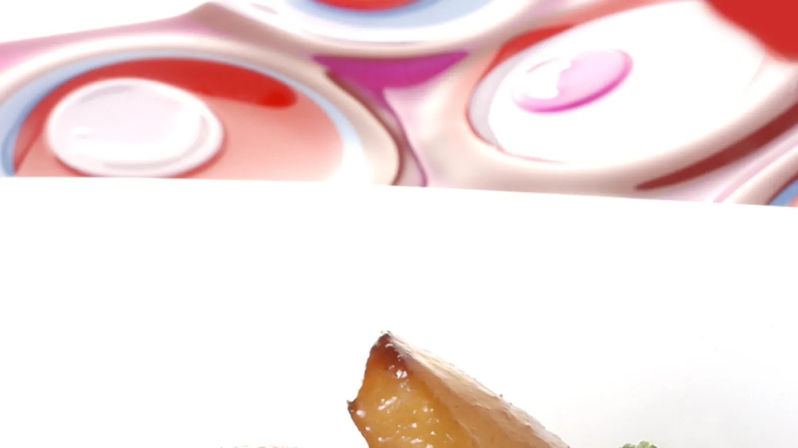 Monta la mitad de la nata con una varilla manual. Sirve 1-2 tortitas por ración, coloca encima 3 trozos de pera confitada, decora con un poco del jarabe resultante de confitar las peras y con la nata (montada y sin montar). Adorna con las grosellas y las hojas de menta.