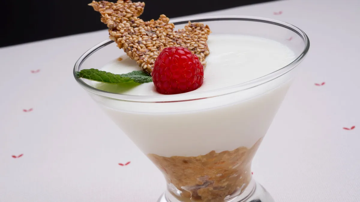 Eva Arguiñano prepara un postre de cuajada casera con galletas, frambuesas y guirlache de sésamo y pistachos.