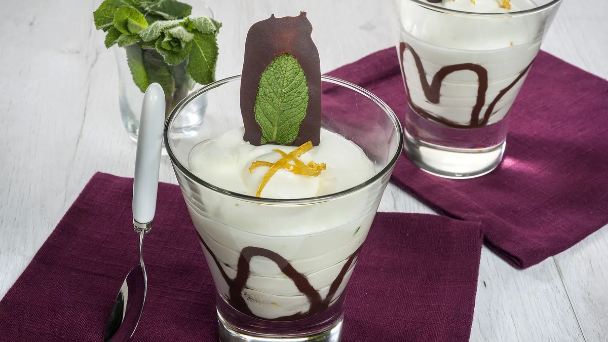 Postre de vasitos de mousse de limón con hojas de menta con chocolate y cáscaras de limón confitadas, receta de Joseba Arguiñano para sorprender.
