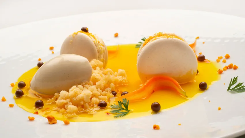 Disponemos las laminas de zanahoria, colocamos el macarrón a un lado del plato y al otro una quenelle de helado acompañado de una cucharada de granizado, terminaremos con una pizca de azúcar de azafrán en el borde y unos brotes de zanahoria.