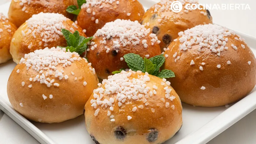 Para formar las otras 10 bolitas de masa con chocolate, aplasta las porciones de masa, coloca encima de cada una unas pepitas de chocolate y amásalas un poco envolviendo las pepitas de chocolate hasta que quede dentro de cada bolita. Déjalas fermentar hasta que doblen su volumen (30 minutos aproximadamente).