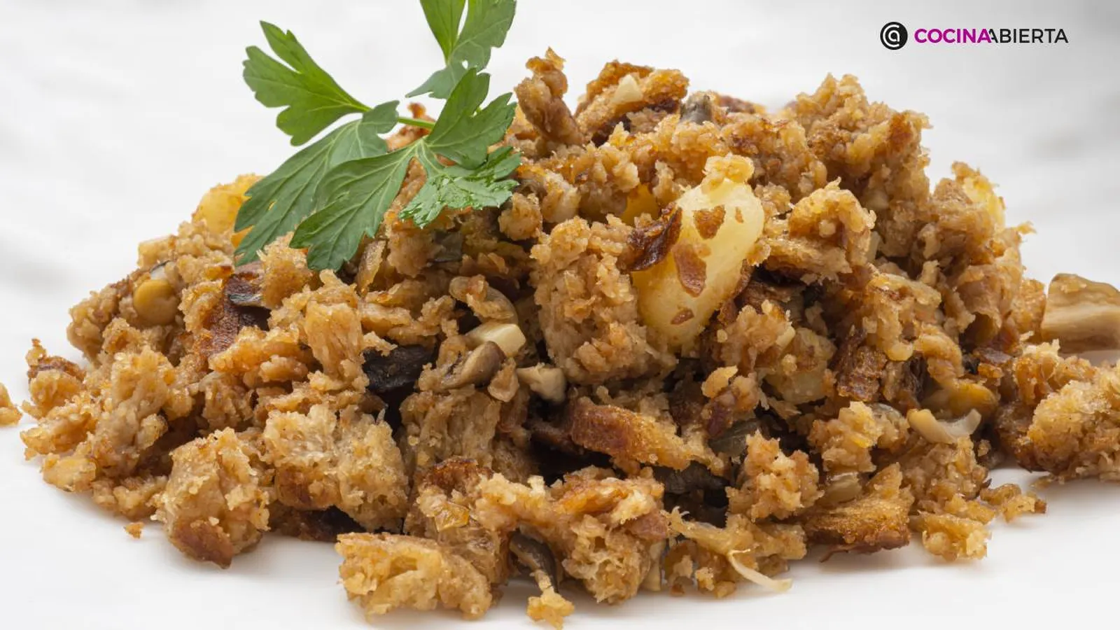 Sirve las migas de pastor o migas de pan y adorna los platos con unas hojas de perejil.