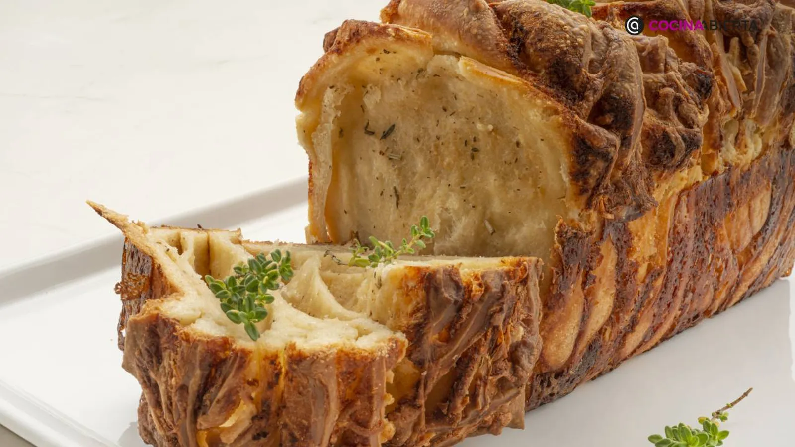 Retira el molde del horno, deja que se temple y desmóldalo. Sirve el pan de ajo y queso de Arguiñano, pudiendo adornarlo con unas hojas de tomillo.