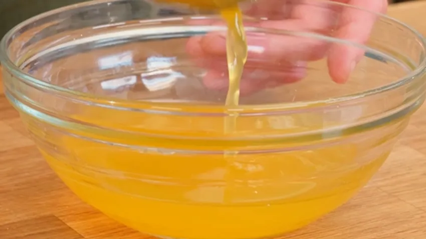 Retira el cazo del fuego y vierte el almíbar en un bol. Déjalo reposar a temperatura ambiente hasta que esté totalmente frío antes de añadir la fruta. Esto es importante para no alterar el sabor ni la textura del maracuyá.