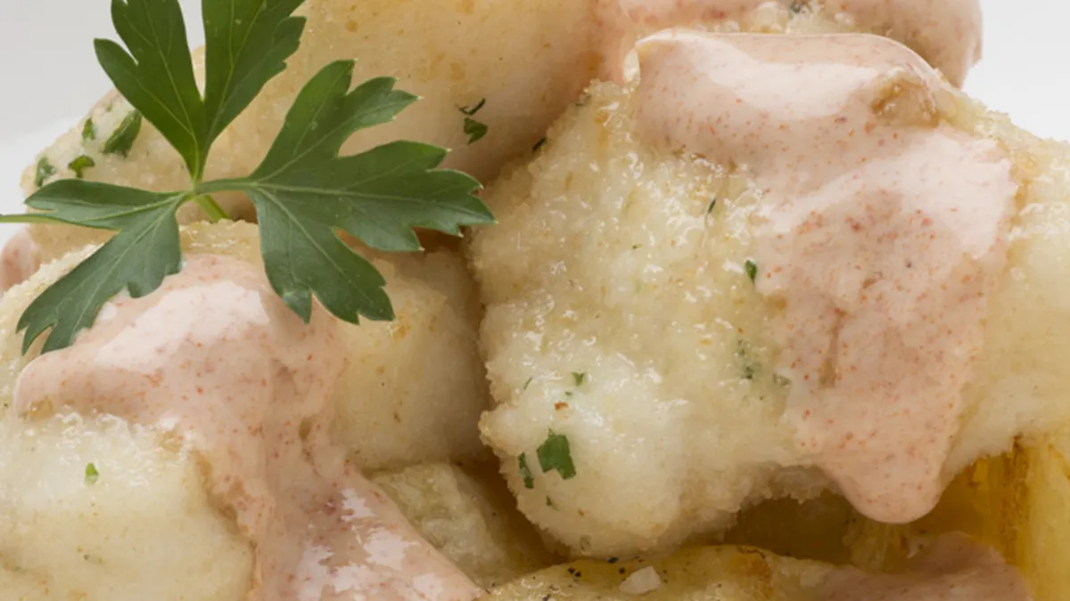 Rape empanado con patatas bravas