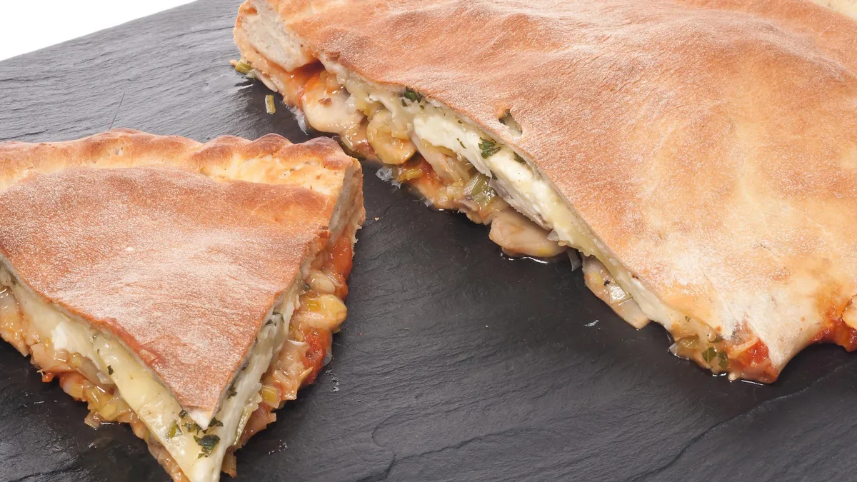 Receta de pizza calzone rellena de champiñones. Aprende a hacer la masa para la pizza calzone y rellénala con verduras: champiñones, ajos tiernos, puerros...
