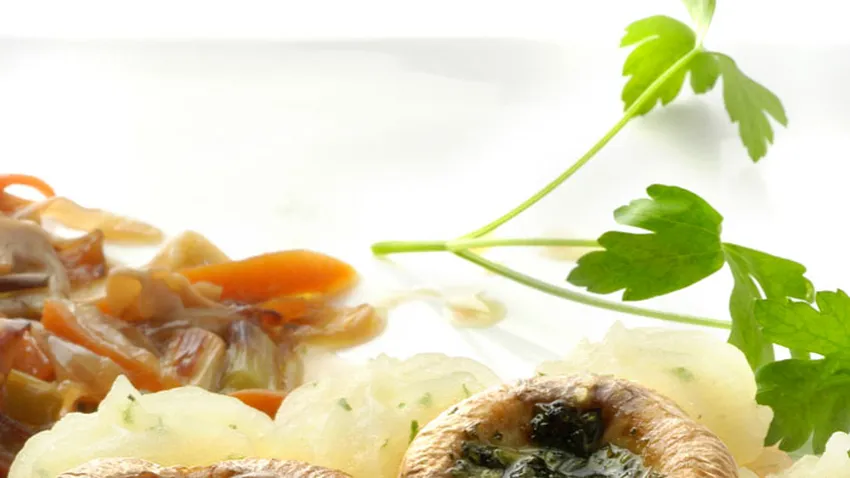 Fríe las rodajas de calabaza en una sartén con aceite. Sirve en el fondo de una fuente la rodaja de calabaza, marca encima un aro de puré de patata con la ayuda de la manga y coloca en el centro tres o cuatro champiñones, coloca en un costado la verdura salteada. Decora con una rama de perejil.