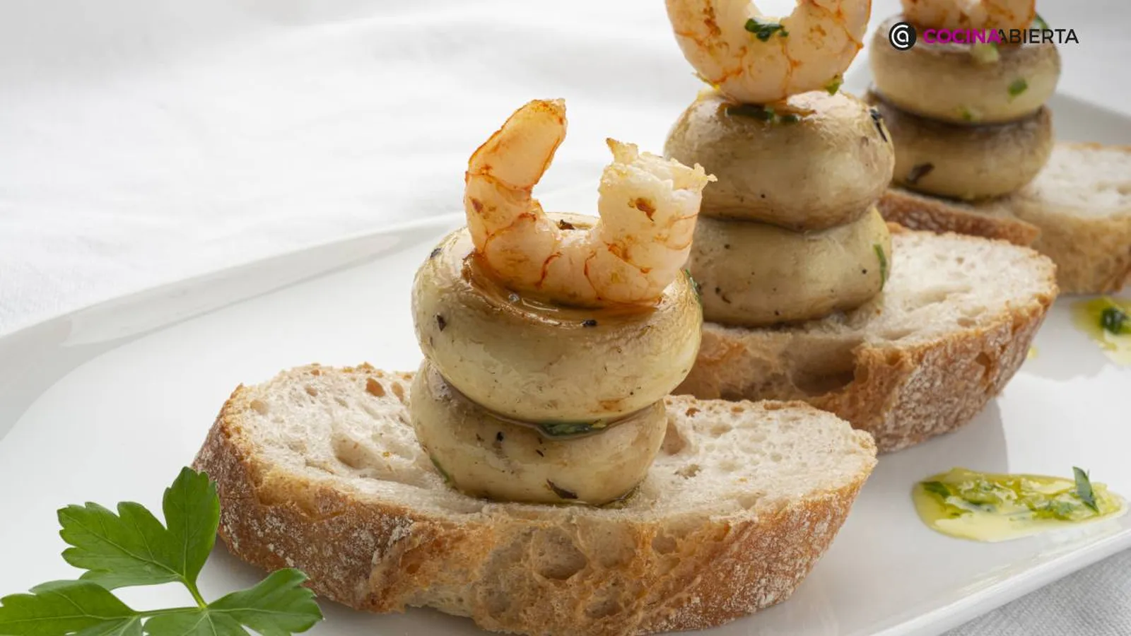 Sirve 3 pinchos de champiñones a la plancha con gambas en cada plato y decóralos con unas hojas de perejil.