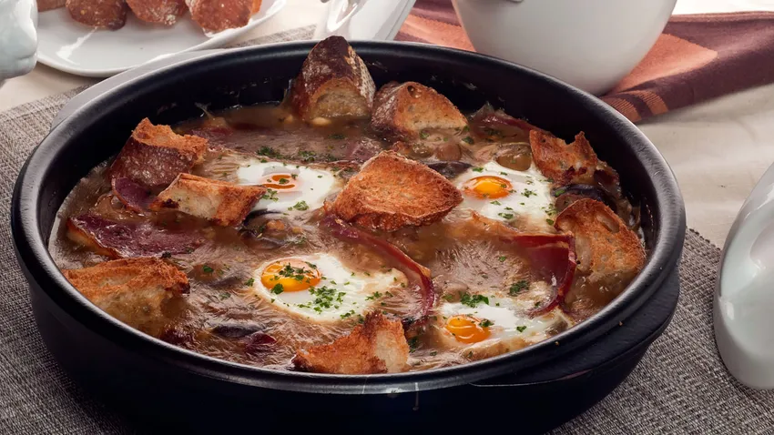 Receta de Bruno Oteiza de cazuela de champiñones en salsa acompañados de huevos escalfados, jamón y rebanadas de pan crujientes.
