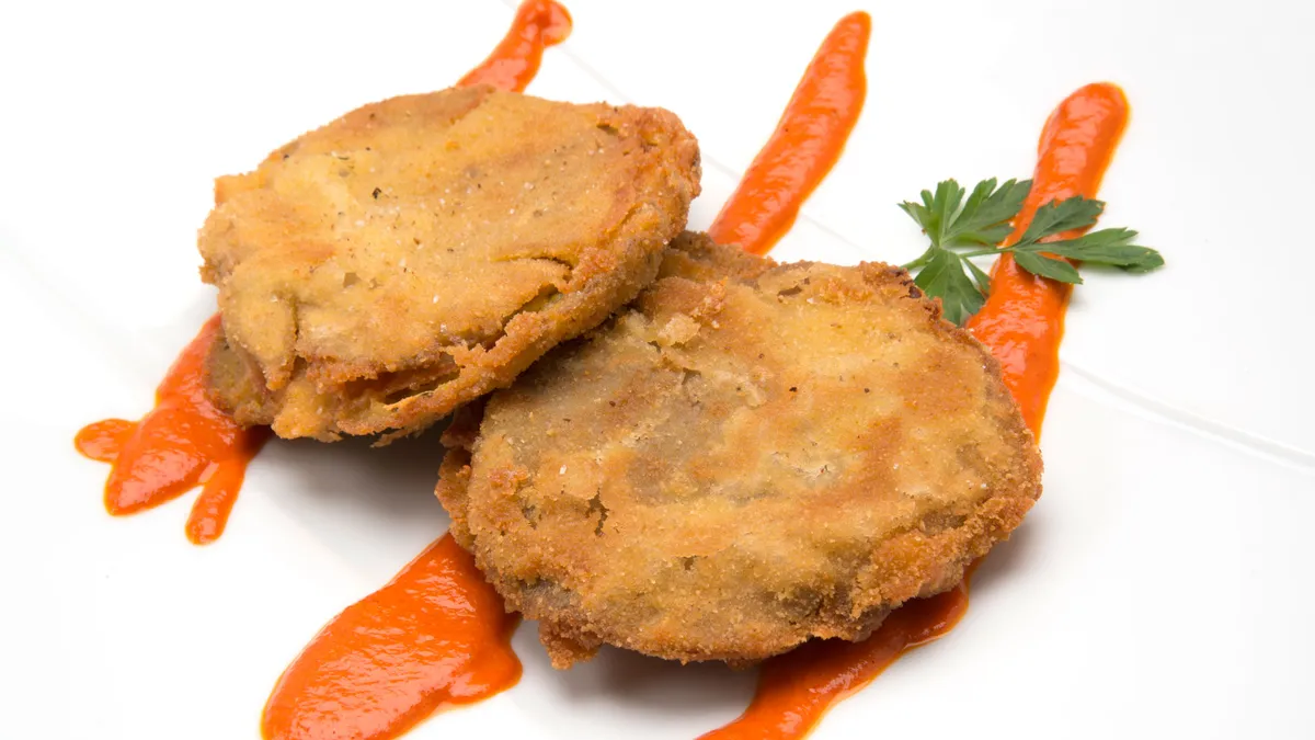Sirve la salsa de pimiento con los San Jacobos y adorna con unas hojas de perejil.