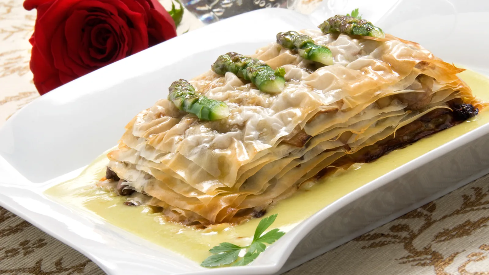 Corta las puntas de los espárragos reservadas por la mitad, (a lo largo) y saltéalas en una sartén con un chorrito de aceite. Sazona. Corta las milhojas en porciones y sirve un rectángulo por comensal. Sirve una porción de milhojas de champiñones en plato y coloca encima unas puntas de espárrago. Acompaña con la salsa de espárrago.