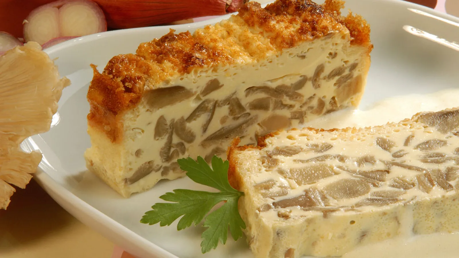 Receta de pastel relleno de setas elaborado al baño maría y acompañado de una salsa de queso y nata.