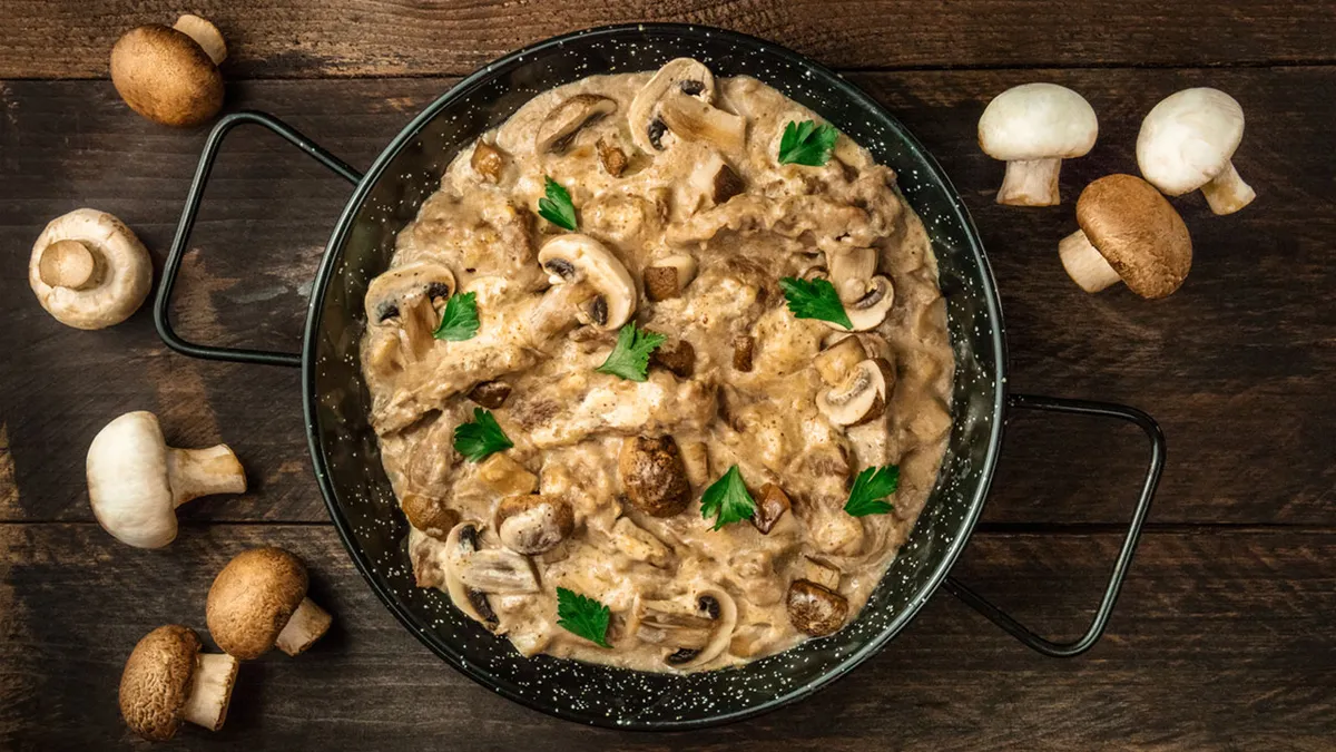 Deliciosos filetes de pavo empanados acompañados con una guarnición de setas al roquefort. Un plato de carne que combina sabores intensos y diferentes texturas.