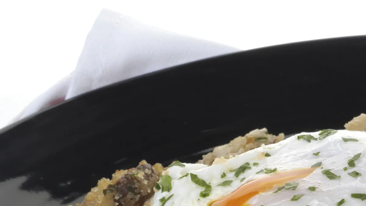 Receta de setas gratinadas a la provenzal con pan rallado, ajo y perejil y con huevos escalfados de acompañamiento.