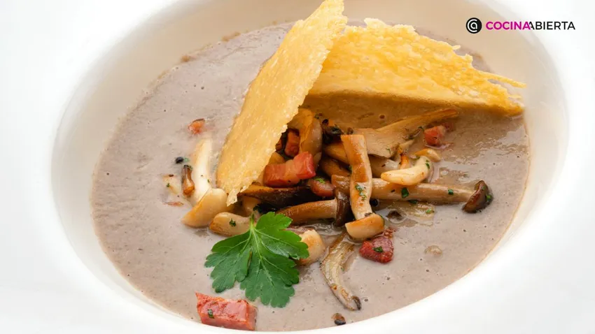 Las opciones para acompañar esta sopa dependen del momento y la ocasión. En esta receta, Joseba Arguiñano sugiere crujientes de queso y setas salteadas con beicon.